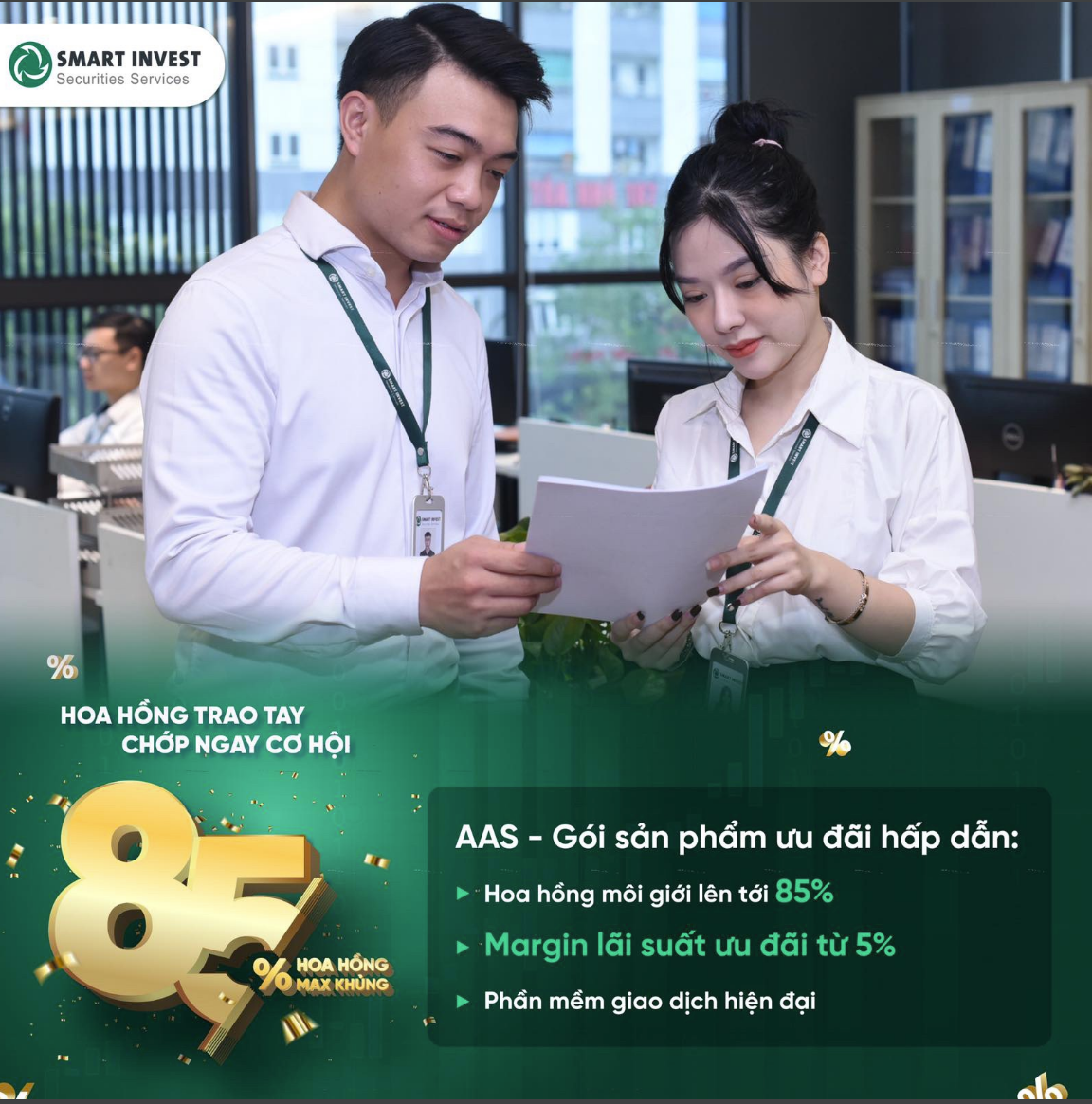 Vào ngày 01/11/2021 vừa qua, AAS đã tung ra gói sản phẩm ưu đãi hấp dẫn với tỷ lệ hoa hồng lên đến 85% dành cho môi giới. Các khách hàng giao dịch tại AAS được cung cấp dịch vụ margin lãi suất ưu đãi từ 5% và hỗ trợ một loạt phần mềm giao dịch hiện đại.