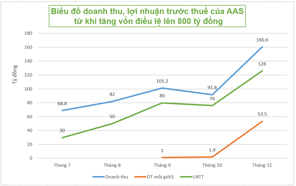 Điểm sáng đáng chú ý, doanh thu nghiệp vụ môi giới chứng khoán từ mức gần 2 tỷ đồng trong tháng trước đã tăng lên 53,5 tỷ đồng chiếm khoảng 30% doanh thu tháng 11 của AAS. Nghiệp vụ môi giới giúp doanh thu trong tháng 11 tăng đột biến so với các tháng trước, cụ thể tăng 75% so với tháng 10.
