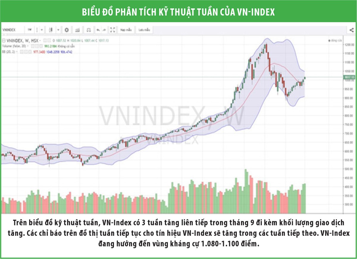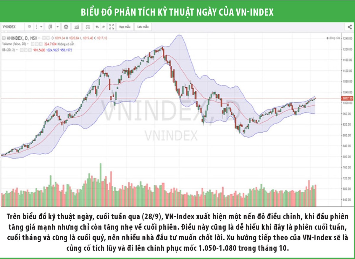 Tháng 10, với tình hình vĩ mô dự báo tiếp tục ổn định, sự quyết tâm của Chính phủ trong việc hoàn thiện thị trường chứng khoán để được nâng hạng từ cận biên lên mới nổi, cũng là thời điểm các doanh nghiệp niêm yết công bố kết quả kinh doanh quý III/2018, kỳ vọng các yếu tố này sẽ hỗ trợ VN-Index bứt phá lên vùng 1100 điểm.