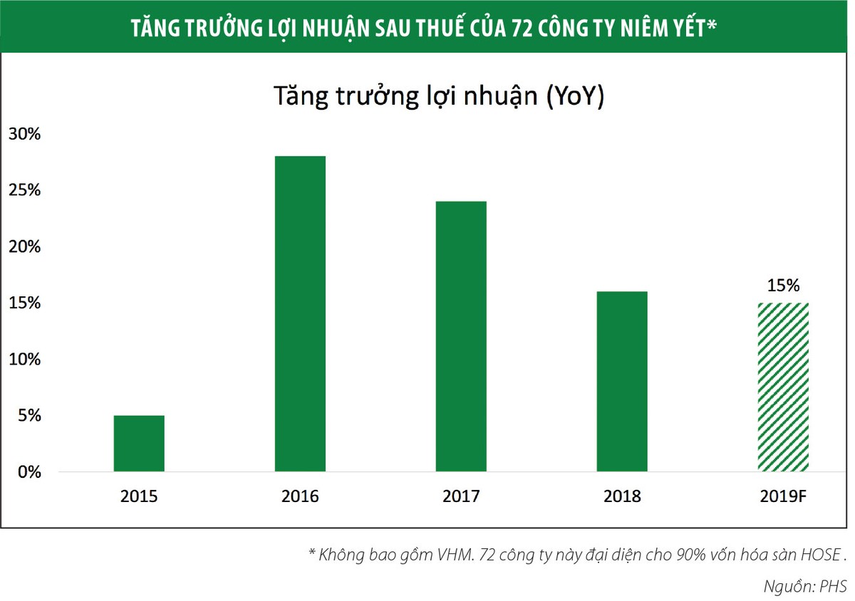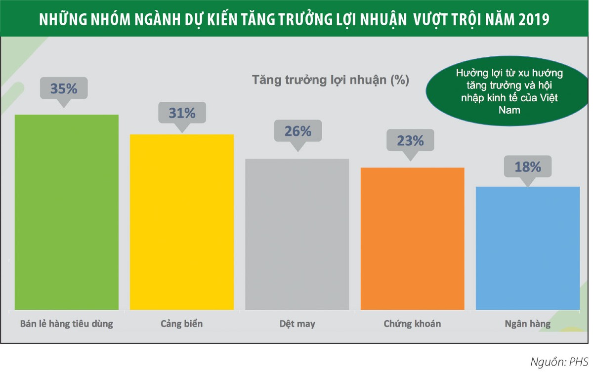 Một số nhóm ngành được PHS đánh giá sẽ có mức tăng trưởng lợi nhuận vượt trội trong năm 2019 nhờ hưởng lợi từ xu hướng tăng trưởng và hội nhập kinh tế của Việt Nam bao gồm bán lẻ hàng tiêu dùng (35%), cảng biển (31%), dệt may (26%), chứng khoán (23%) và ngân hàng (18%).