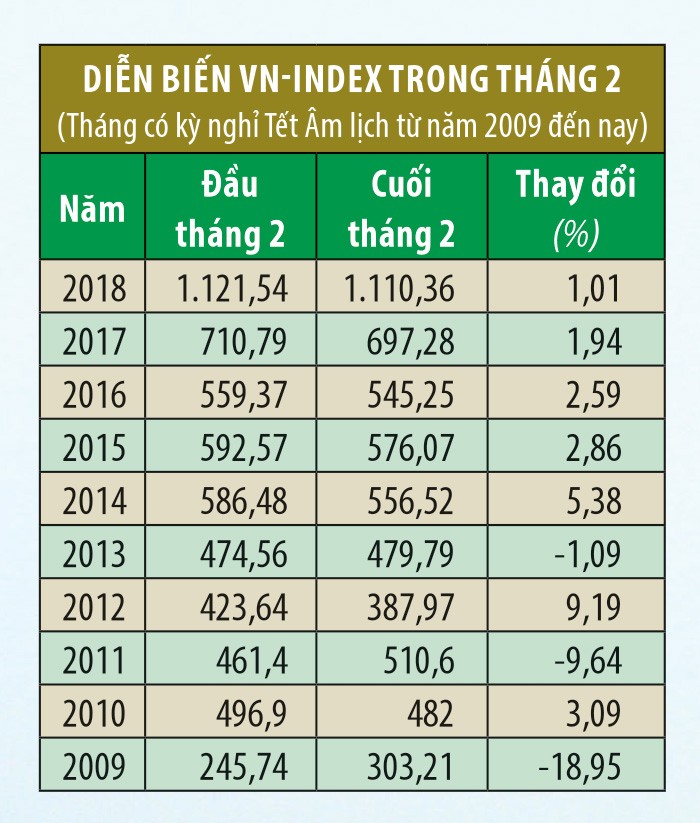 Trong tháng 1/2019, phân tích của Công ty Chứng khoán FPT (FPTS) về hiệu ứng kỳ nghỉ Tết Âm lịch cho thấy, VN-Index đã tăng 11/18 lần, HNX Index tăng 9/13 lần trong 5 ngày giao dịch sau Tết. Rộng hơn, theo thống kê diễn biến của chỉ số VN-Index trong tháng 2 hàng năm - tháng trùng với kỳ nghỉ Tết Âm lịch từ năm 2009 đến nay, xu hướng tăng điểm cũng chiếm ưu thế gần như tuyệt đối với 7/9 năm.