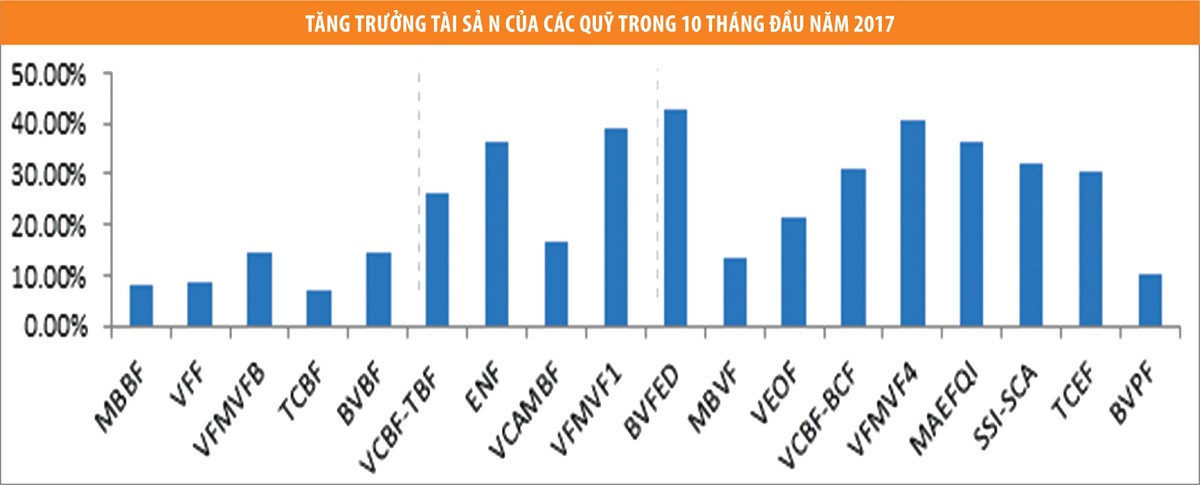 Gần một nửa số quỹ trên thị trường (8 quỹ) có mức tăng trưởng trên 30% trong 11 tháng đầu năm 2017, có thể kể đến như Quỹ Đầu tư cổ phiếu hàng đầu VCBF (VCB-BCF) (31,3%), Quỹ Đầu tư Năng động Eastspring Investments Việt Nam (ENF) tăng 36,4%, Quỹ Đầu tư chứng khoán Việt Nam (VFMVF1) tăng 39%, Quỹ Đầu tư doanh nghiệp hàng đầu Việt Nam (VFMVF4) tăng 40,8%... Đặc biệt, Quỹ Đầu tư cổ phiếu Bảo Việt (BVFED) đứng đầu thị trường về hiệu quả hoạt động có mức tăng trưởng lên tới 43%.
