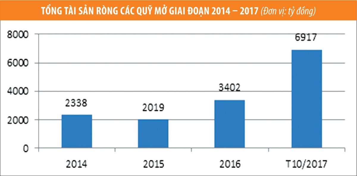 Xét về huy động vốn, năm 2017 ghi nhận sự tăng trưởng đột phá của thị trường quỹ mở Việt Nam. Chỉ riêng trong 10 tháng đầu năm, tổng giá tài sản ròng của các quỹ mở đạt 6.917 tỷ đồng, tăng 103,32% so với cùng kỳ năm 2016. Đây là mức tăng trưởng đột biến trong 4 năm trở lại đây. Các kênh huy động vốn cũng khá đa dạng, từ các công ty quản lý quỹ, công ty chứng khoán, ngân hàng.