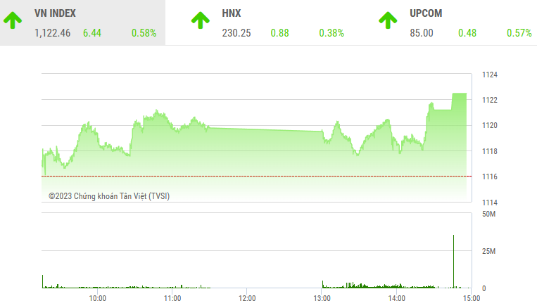 Đóng cửa, sàn HOSE có 233 mã tăng và 145 mã giảm, VN-Index tăng 6,44 điểm (+0,58%), lên 1.122,46 điểm. Tổng khối lượng giao dịch đạt hơn 943,5 triệu đơn vị, giá trị 18.438,9 tỷ đồng, tăng gần 5% về khối lượng và 12% về giá trị so với phiên hôm qua. Giao dịch thỏa thuận đóng góp hơn 73 triệu đơn vị, giá trị 2.132 tỷ đồng.