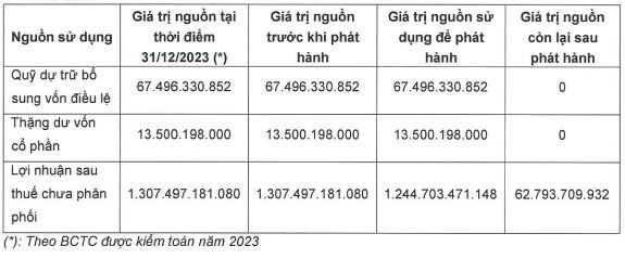 Nguồn vốn thực hiện phát hành từ lợi nhuận sau thuế chưa phân phối, thặng dư vốn cổ phần và quỹ dự trữ bổ sung vốn điều lệ theo báo cáo tài chính kiểm toán năm 2023.