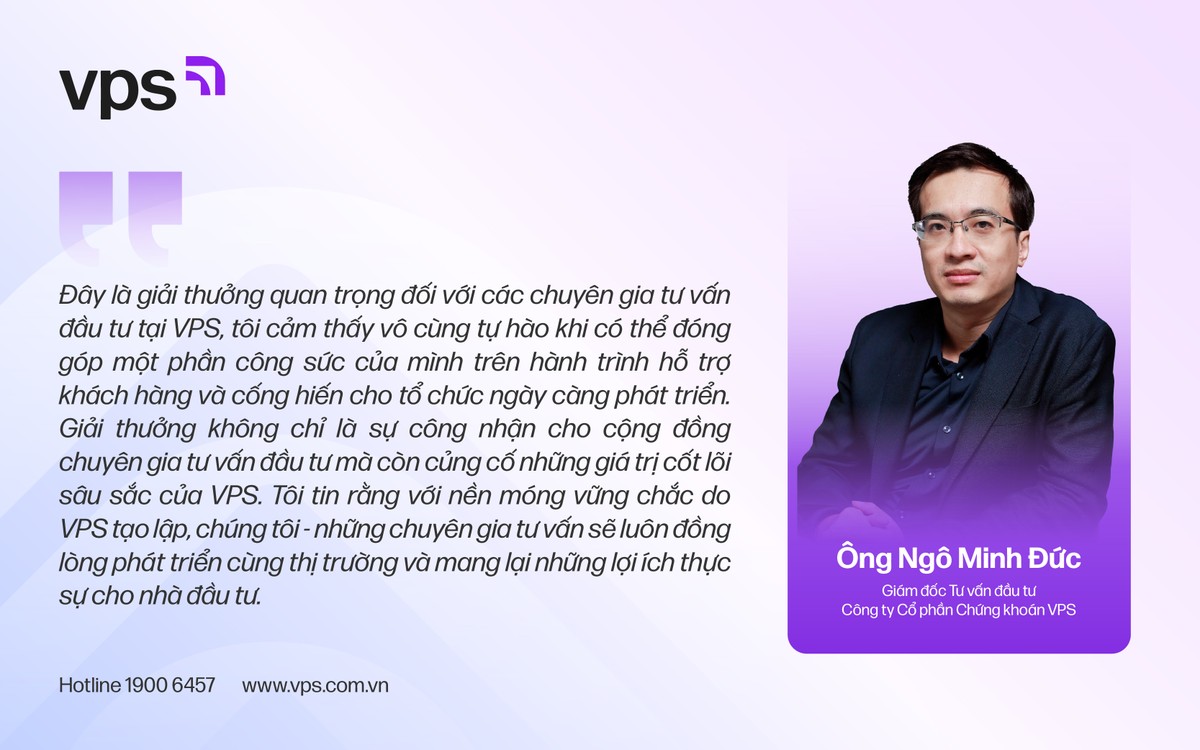Chia sẻ về giải thưởng lần này, Ông Ngô Minh Đức - Giám đốc Tư vấn đầu tư Công ty Cổ phần Chứng khoán VPS chia sẻ: “Đây là giải thưởng quan trọng đối với các chuyên gia tư vấn đầu tư tại VPS, tôi cảm thấy vô cùng tự hào khi có thể đóng góp một phần công sức của mình trên hành trình hỗ trợ khách hàng và cống hiến cho tổ chức ngày càng phát triển. Giải thưởng không chỉ là sự công nhận cho cộng đồng chuyên gia tư vấn đầu tư mà còn củng cố những giá trị cốt lõi sâu sắc của VPS. Tôi tin rằng với nền móng vững chắc do VPS tạo lập, chúng tôi - những chuyên gia tư vấn sẽ luôn đồng lòng phát triển cùng thị trường và mang lại những lợi ích thực sự cho nhà đầu tư”.