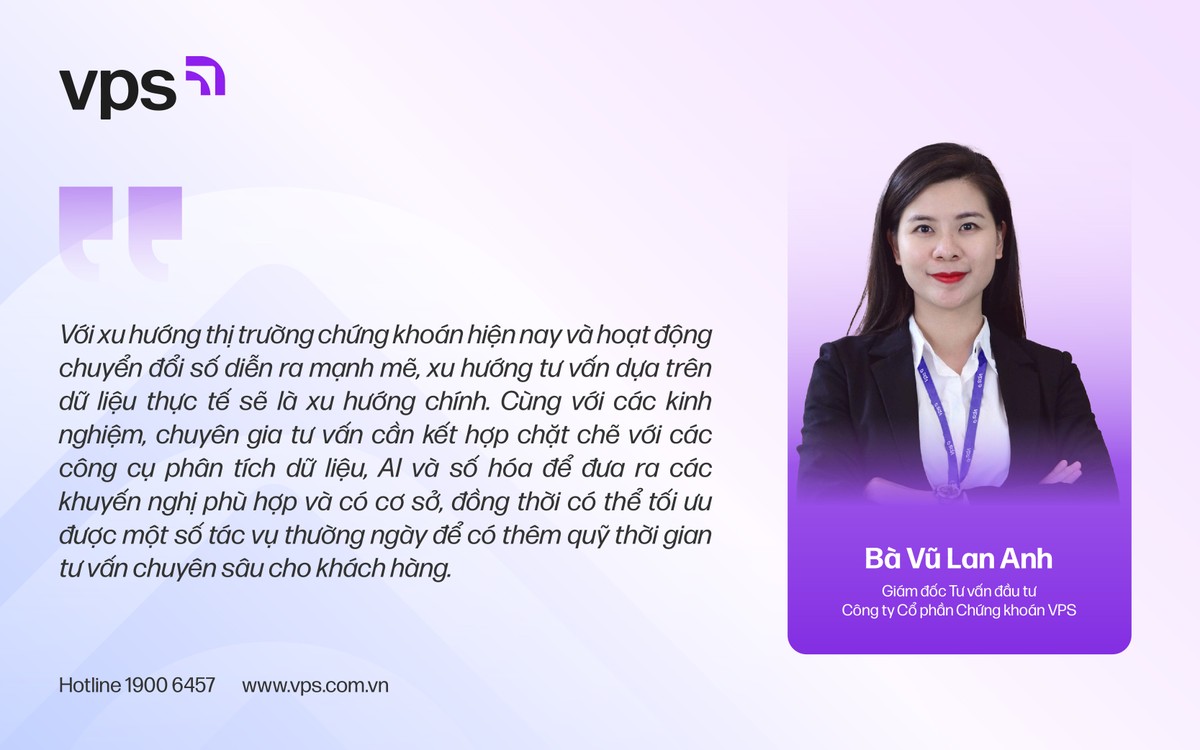 “Với xu hướng thị trường chứng khoán hiện nay và hoạt động chuyển đổi số diễn ra mạnh mẽ, xu hướng tư vấn dựa trên dữ liệu thực tế sẽ là xu hướng chính. Cùng với các kinh nghiệm, chuyên gia tư vấn cần kết hợp chặt chẽ với các công cụ phân tích dữ liệu, AI và số hóa để đưa ra các khuyến nghị phù hợp và có cơ sở. Đồng thời có thể tối ưu được một số tác vụ thường ngày để có thêm quỹ thời gian tư vấn chuyên sâu cho khách hàng”, bà Vũ Lan Anh - Giám đốc Tư vấn đầu tư VPS chia sẻ.