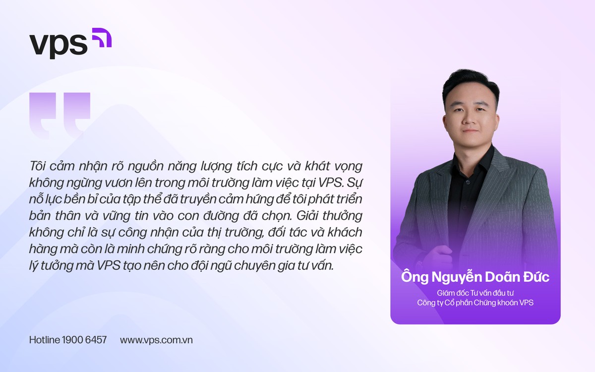 “Tôi cảm nhận rõ nguồn năng lượng tích cực và khát vọng không ngừng vươn lên trong môi trường làm việc tại VPS. Sự nỗ lực bền bỉ của tập thể đã truyền cảm hứng để tôi phát triển bản thân và vững tin vào con đường đã chọn. Giải thưởng không chỉ là sự công nhận của thị trường, đối tác và khách hàng mà còn là minh chứng rõ ràng cho môi trường làm việc lý tưởng mà VPS tạo nên cho đội ngũ chuyên gia tư vấn” - ông Nguyễn Doãn Đức bày tỏ.