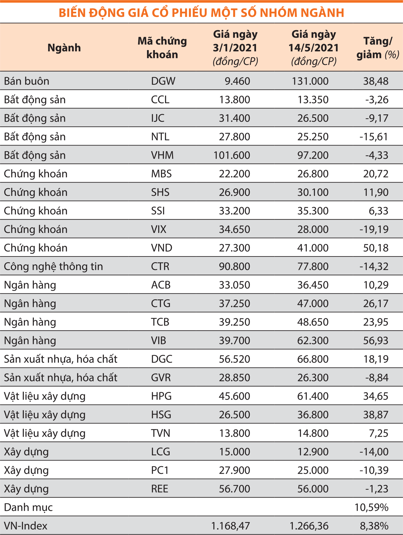 Phân tích diễn biến giá một nhóm cổ phiếu được đánh giá tiềm năng trong quý I/2021 cho thấy, điểm chung là VN-Index tăng nhưng không có sự đồng pha từ các nhóm cổ phiếu. Ngoài nhóm thép và ngân hàng vẫn cho thấy rõ xu hướng đi lên, phần lớn các nhóm ngành khác ghi nhận sụt giảm (xem bảng).