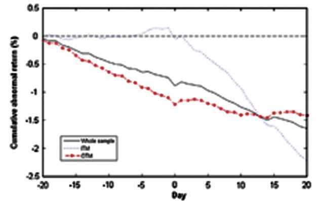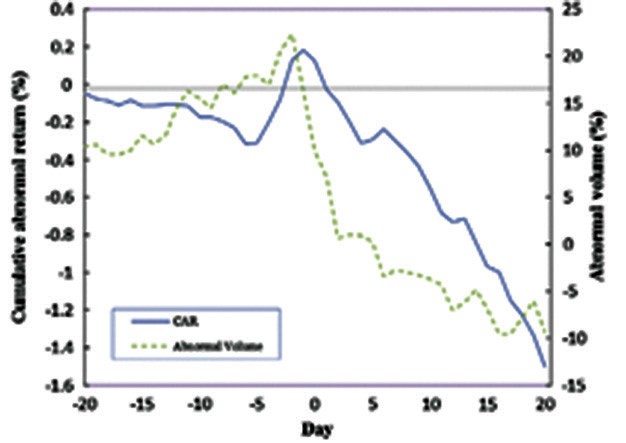 Quanh thời điểm công bố phát hành: Nghiên cứu của các tác giả cho tỷ suất lợi nhuận và thanh khoản quanh thời điểm phát hành +/- 20 phiên giao dịch. Kết quả cho thấy, trước ngày phát hành 5 ngày, có sự đột biến trong tỷ suất sinh lợi bất thường (Abnormal Return, được tính bằng cách lấy tỷ suất sinh lợi trừ đi tỷ suất sinh lợi kỳ vọng theo phần bù rủi ro), đồng thời hiện diện sự đột biến trong thanh khoản bất thường của cổ phiếu cơ sở. Và sau ngày công bố phát hành, cả tỷ suất sinh lợi bất thường và thanh khoản bất thường đều giảm dưới mức 0, và hiệu ứng kéo dài rõ ràng sau thời điểm công bố phát hành.