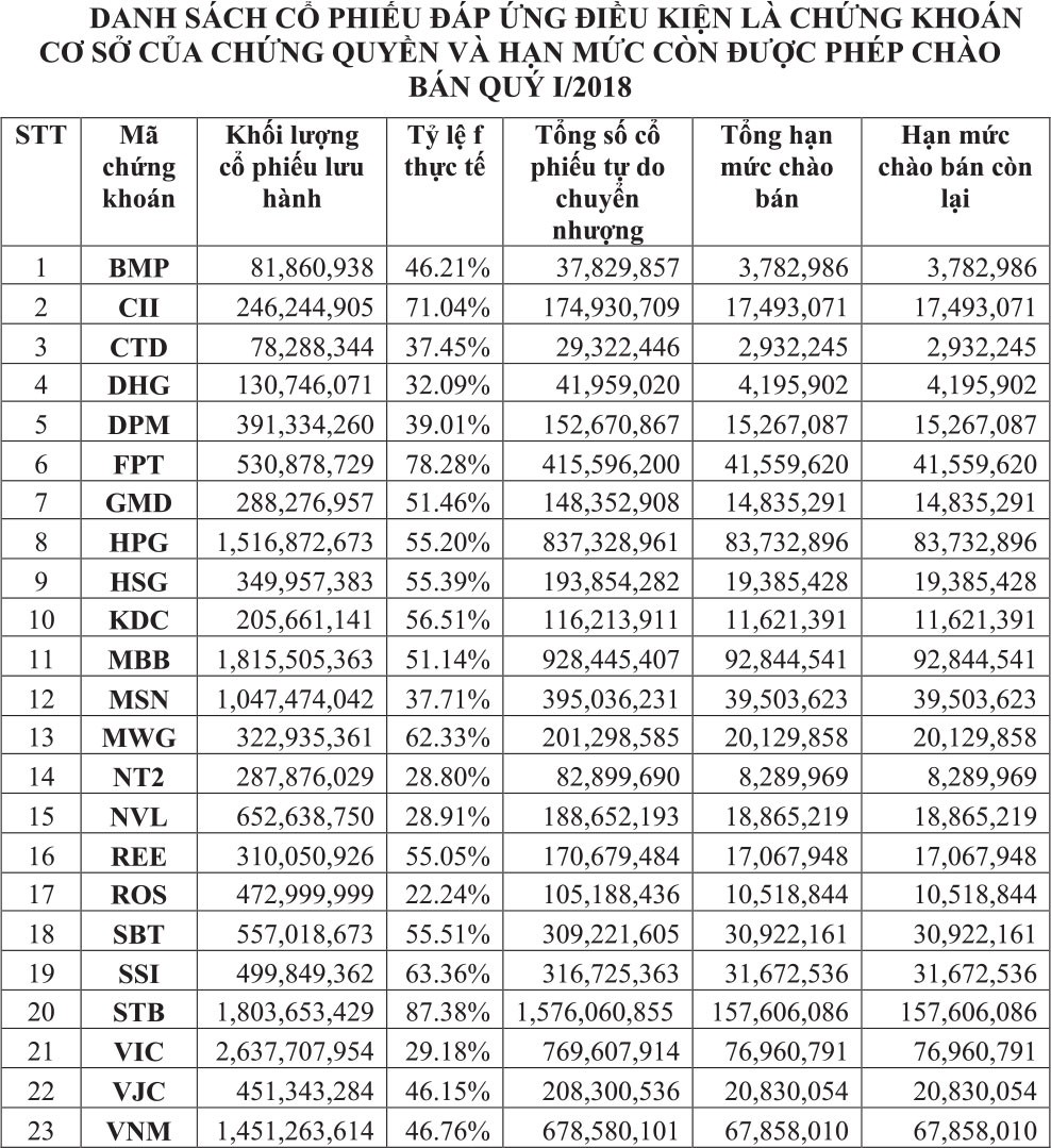 HOSE đã chốt danh sách 23 mã cổ phiếu đáp ứng các điều kiện là chứng khoán cơ sở của chứng quyền. Các cổ phiếu này đạt tiêu chí về vốn hóa, thanh khoản và khối lượng cổ phiếu tự do chuyển nhượng. Nhiều CTCK đánh giá danh sách 23 chứng khoán cơ sở được phép phát hành chứng quyền của HOSE đều là các mã bluechip có giá trị vốn hóa lớn, thanh khoản cao giúp tổ chức phát hành dễ dàng hơn trong việc phòng ngừa rủi ro cho việc phát hành chứng quyền đúng theo quy định.