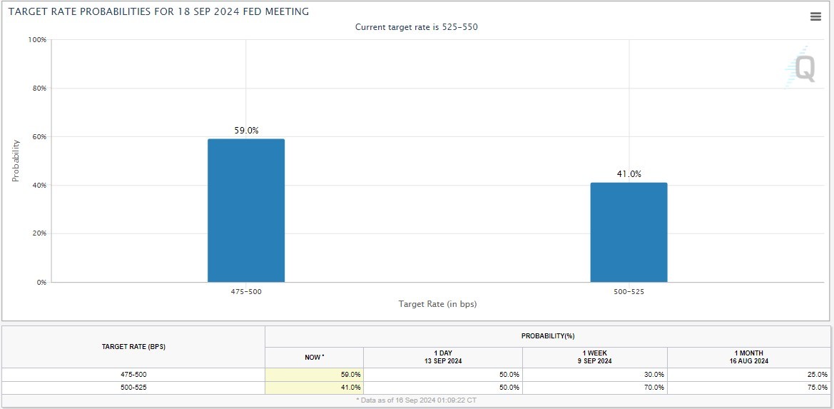 Theo dự báo của CME GROUP (ngày 16/09), 59% khả năng Fed sẽ hạ 0.5 điểm cơ bản về mức 4.75% - 5% và 41% khả năng Fed hạ 0.25 điểm cơ bản về mức 5%-5.25%.