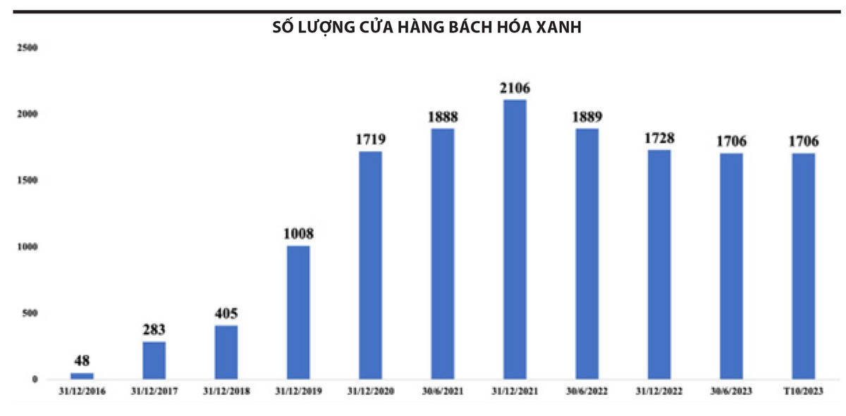 Sau đó, chuỗi Bách Hóa Xanh liên tục bị thu hẹp, tính tới tháng 10/2023 còn 1.706 cửa hàng, giảm 19% so với mức đỉnh năm 2021, tương ứng giảm 400 cửa hàng.