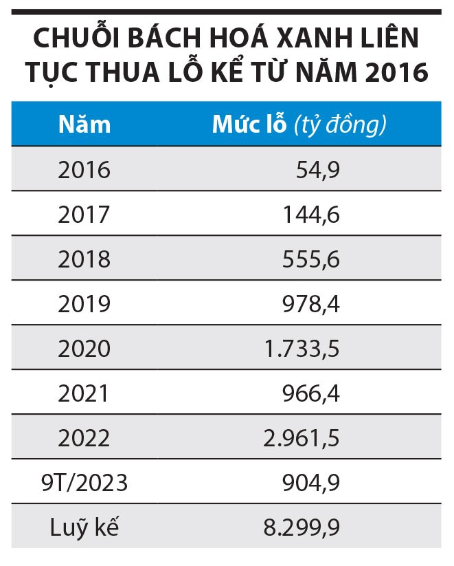 Cụ thể, kết thúc năm 2022, chuỗi Bách Hóa Xanh lỗ 2.961,5 tỷ đồng. Sang năm 2023, chuỗi cửa hàng này lỗ thêm 904,9 tỷ đồng tính đến hết tháng 9, nâng lỗ luỹ kế kể từ năm 2016 lên 8.300 tỷ đồng.