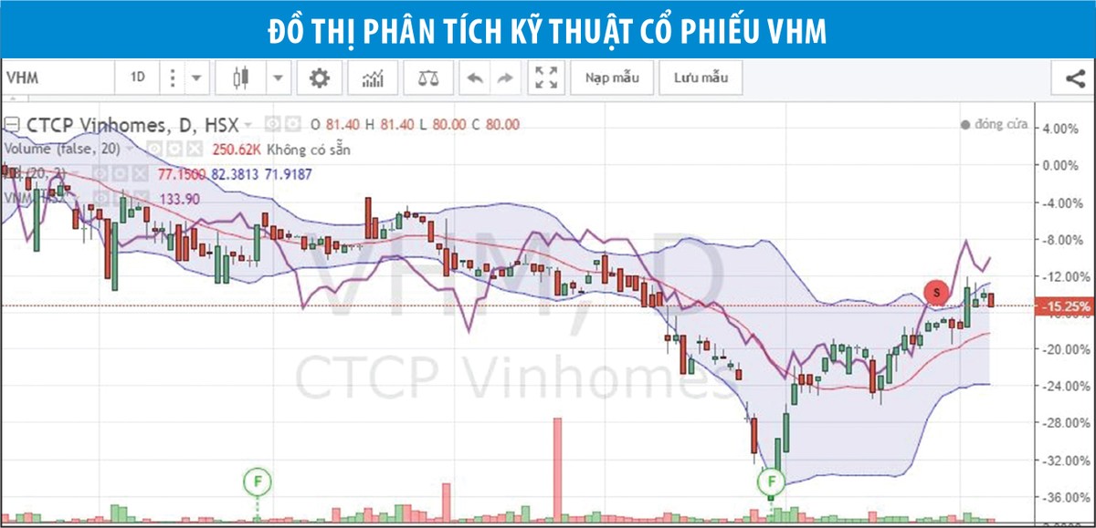 Cổ phiếu VHM tạo đáy tại 63.000 đồng/cổ phiếu và tăng liên tục trong hơn 1 tháng sau đó, lên mốc 82.000 đồng/cổ phiếu. Cuối tuần qua, cổ phiếu này giảm giá, đầu tuần này đứng giá. Diễn biến giá trong các phiên tới có thể kém khả quan.