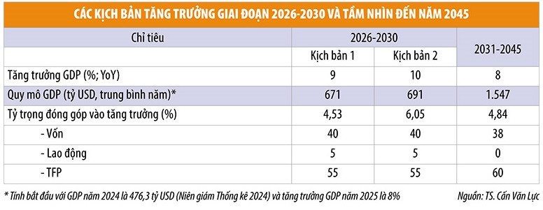 Để bù đắp khoảng trống này, yếu tố TFP - đại diện cho công nghệ, quản trị và đổi mới sáng tạo - phải gánh vác, với tỷ lệ 55% ở kịch bản tăng trưởng 9-10% trong giai đoạn 2026-2030. Trong 10 năm tiếp sau, tỷ lệ này được dự tính phải tăng tới 60%.