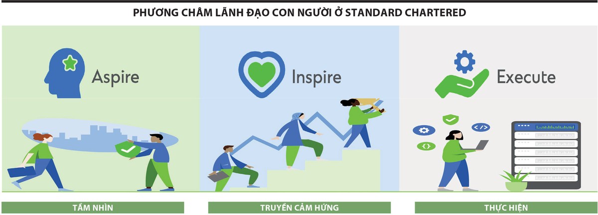 Chuyển đổi và cải tiến cần bắt đầu từ tư duy đổi mới, từ cấp lãnh đạo cho đến các vị trí khác nhau trong đội ngũ nhân viên. Theo đó, phương châm lãnh đạo con người ở Standard Chartered tập trung vào ba mảng: Tầm nhìn - Truyền cảm hứng - Thực hiện. Đây là cam kết của quản lý ở các cấp khác nhau trong Ngân hàng.