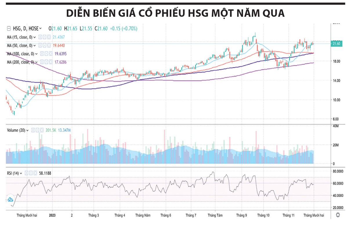 Sau một nhịp điều chỉnh kéo dài khoảng 1 tháng từ mức đỉnh thiết lập vào cuối tháng 9/2023, giá cổ phiếu HSG của Công ty cổ phần Tập đoàn Hoa Sen cũng chỉ mất thời gian tương tự để nhanh chóng quay trở lại đỉnh cũ. Cụ thể, từ 26/10-30/11/2023, cổ phiếu HSG đã tăng hơn 29%, từ 16.600 đồng/cổ phiếu lên 21.450 đồng/cổ phiếu. Nếu so với mức đáy ngày 15/11/2022 là 7.140 đồng/cổ phiếu, cổ phiếu này đã tăng tới hơn 200% chỉ trong hơn 1 năm.