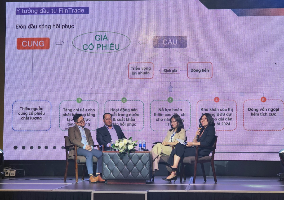 Về phía FIDT, ông Phương chia sẻ 4 câu chuyện đầu tư chính năm 2024. Một là Việt Nam đầu tư năng lượng và cơ sở hạ tầng với các nhóm xây lắp dầu khí thượng nguồn; xây dựng hạ tầng và xây lắp điện. Hai là xuất khẩu hồi phục mang lại cơ hội cho nhóm thuỷ sản, đặc biệt là cá tra. Ba là đa dạng chuỗi cung ứng, Việt Nam vẫn sẽ thu hút FDI nhờ sở hữu nhiều lợi thế cạnh tranh rõ ràng với tâm điểm là bất động sản khu công nghiệp. Bốn là câu chuyện KRX cùng nâng hạng thị trường với chủ điểm là cổ phiếu chứng khoán.
