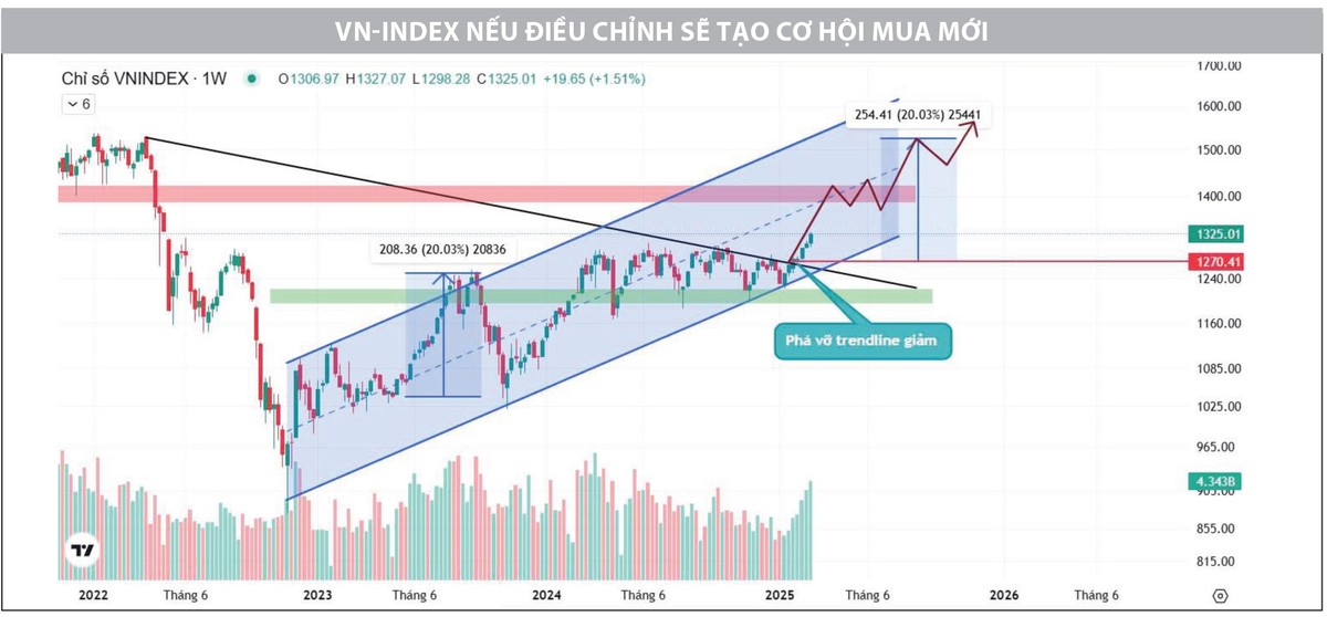 Về mặt kỹ thuật, VN-Index duy trì đà tăng với thanh khoản cải thiện, cho thấy xu hướng tăng ngắn hạn được củng cố. Mặc dù vậy, khi chỉ số tiếp tục đi lên trong một vài phiên tới có thể sẽ kích hoạt việc chốt lời ngắn hạn. Trong kịch bản thận trọng, mốc 1.310 điểm sẽ là ngưỡng hỗ trợ để giữ đà tăng. Nếu chỉ số điều chỉnh xuống dưới ngưỡng này, khả năng điều chỉnh kỹ thuật sâu hơn có thể xảy ra. Tuy nhiên, với những yếu tố hỗ trợ từ dòng tiền, tâm lý thị trường và nền tảng vĩ mô, những nhịp điều chỉnh trong giai đoạn này vẫn là cơ hội để mua vào.
