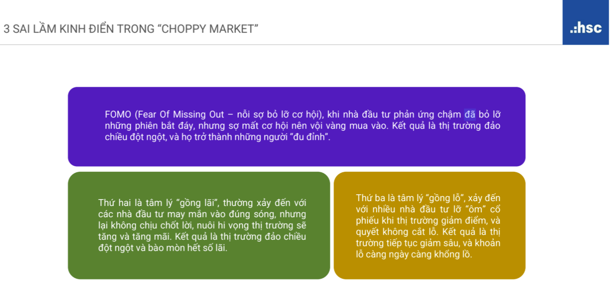 Khẳng định rằng “thị trường răng cưa” là một thị trường rất khó nhằn với nhiều nhà đầu tư, ông Nguyễn Văn Quý, Chuyên gia phân tích cao cấp khách hàng cá nhân HSC cho biết, có ba loại sai lầm phổ biến nhất trong giai đoạn này là FOMO; Gồng lãi; Gồng lỗ.