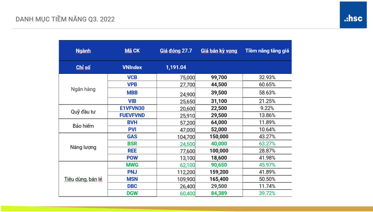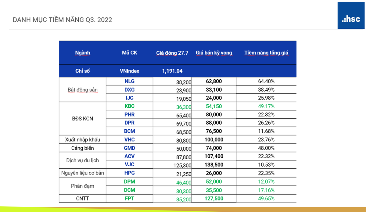 Các ngành hàng HSC khuyến nghị ưu tiên là tiêu dùng – bán lẻ, hàng không và nhóm xuất khẩu, cảng biển, bất động sản khu công nghiệp, năng lượng). Ngành phòng thủ cổ tức cao: công nghệ, năng lượng, điện, bất động sản khu công nghiệp, bảo hiểm. Ngoài ra, ngành có lợi khi giảm phát và có khả năng đóng góp cho việc giảm tác động của lạm phát đối với các doanh nghiệp: công nghệ, các lĩnh vực áp dụng công nghệ nhiều, tăng hiệu suất lao động.