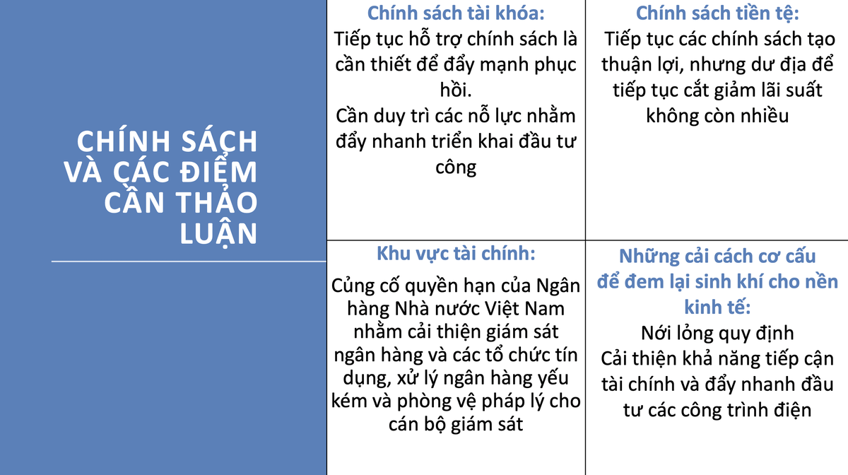 Báo cáo nhấn mạnh tầm quan trọng của việc tiếp tục hỗ trợ nền kinh tế thông qua chính sách tài khóa để củng cố sự phục hồi. Báo cáo khuyến nghị đẩy nhanh tốc độ triển khai các dự án đầu tư cơ sở hạ tầng được tài trợ bởi nguồn lực công. Điều này sẽ giúp kích thích nền kinh tế hơn nữa, với tiềm năng tăng trưởng GDP là 0,1 điểm phần trăm cho mỗi mức tăng 1 điểm phần trăm trong đầu tư công tính theo tỷ lệ GDP. Trong khi đó, về chính sách tiền tệ, dư địa cho việc cắt giảm lãi suất thêm nữa bị hạn chế do chênh lệch lãi suất giữa thị trường trong nước và quốc tế.