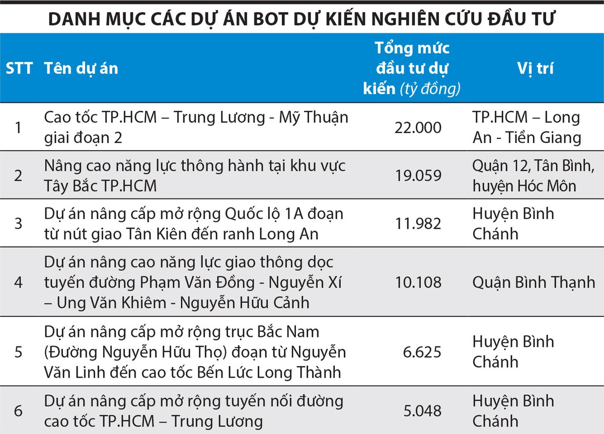 Theo CII, 6 dự án trên được ban lãnh đạo Công ty lựa chọn dựa trên các tiêu chí: có thể giải quyết ách tắc giao thông một cách tổng thể; có thể kết nối với các dự án hiện hữu của CII; đã có quy hoạch phát triển và có thể hài hòa lợi ích giữa doanh nghiệp BOT và người dân.