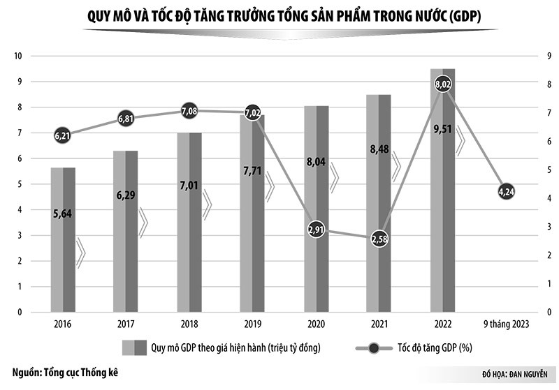 Về hạn chế, Chính phủ nhìn nhận, cơ cấu kinh tế và mô hình tăng trưởng chưa có nhiều thay đổi đáng kể. Mức độ cải thiện về năng suất, chất lượng chưa đạt như kỳ vọng, khả năng chống chịu của nền kinh tế còn hạn chế. Tốc độ tăng năng suất lao động trung bình 2021-2022 là 4,7%, năm 2023 ước tăng 4%, thấp hơn khá nhiều so với tốc độ tăng năng suất lao động trung bình giai đoạn 2016-2020 (5,9%). Tỷ trọng công nghiệp chế biến - chế tạo trong GDP tăng chậm, năm 2021 là 24,3%, năm 2022 là 24,7%.