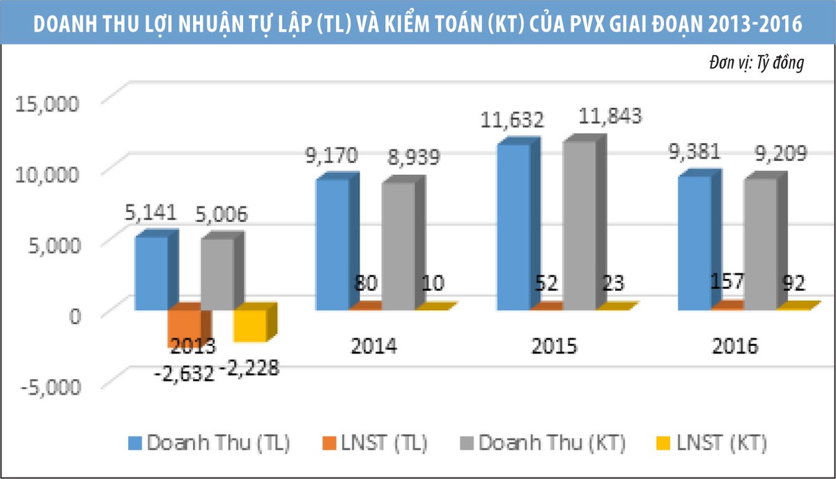 Chẳng hạn, trong Báo cáo tài chính kiểm toán 2013, sau khi được kiểm toán, doanh thu hợp nhất của PVX giảm 135 tỷ đồng so với trước kiểm toán, trong khi giá vốn cùng một số chỉ tiêu khác được điều chỉnh giúp lỗ sau thuế giảm 404 tỷ đồng so với báo cáo tự lập. Năm 2014, sau kiểm toán, doanh thu thuần hợp nhất tuy chỉ giảm nhẹ so với số liệu trước kiểm toán, nhưng LNST giảm tới 87,2% so với số liệu trong BCTC tự lập.