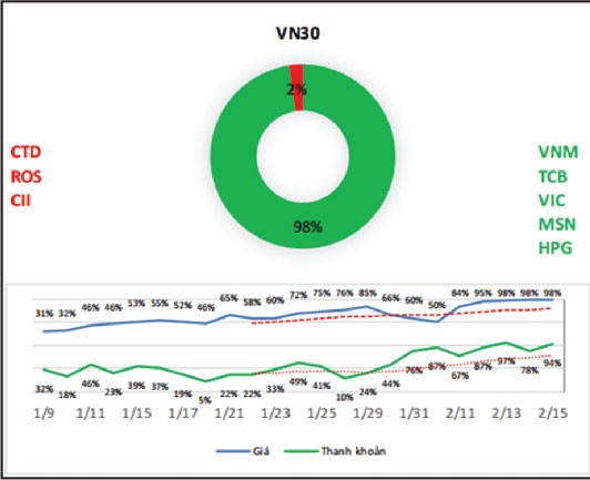 Hầu hết các cổ phiếu có ảnh hưởng mạnh nhất đến VN30 đều đang nằm ở trạng thái tích cực khi có tới 98% các cổ phiếu đang trong xu hướng tăng ngắn hạn. Với việc được thêm mới với tỷ trọng lớn vào rổ VN30, nhân tố mới TCB có thể trở thành ngòi nổ cùng với những gương mặt cũ như VIC hay VNM đẩy chỉ số VN30 đi lên.