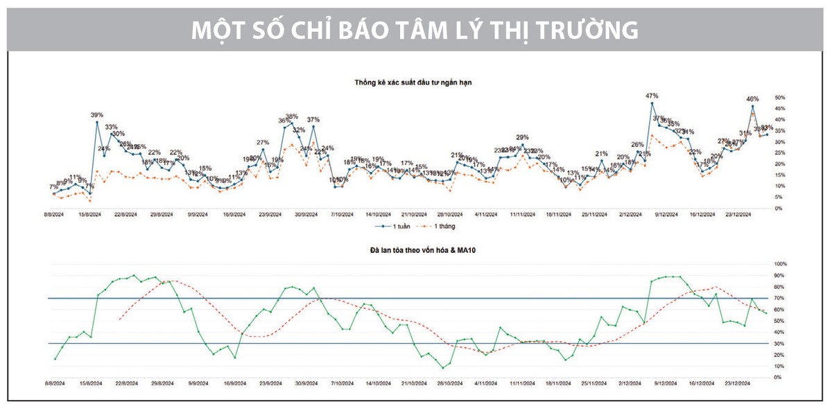 Dựa trên các chỉ báo định lượng, hiện tượng trên là bình thường do hệ quả của áp lực chốt lời ngắn hạn cũng như sự mở rộng đà tăng nhanh trên toàn thị trường dẫn tới điểm mua mới bị hạn chế trong khi thanh khoản chưa tăng mạnh đồng thuận. Theo đó, khi dòng tiền bị co kéo, sự phân hóa và dịch chuyển giữa các nhóm cổ phiếu sẽ tiếp tục mạnh hơn trong tuần tới, các vị thế mua mới cần siết chặt hơn với các quyết định mở vị thế mới nếu không đảm bảo yếu tố nền giá chặt chẽ và dư địa tăng đủ hấp dẫn.