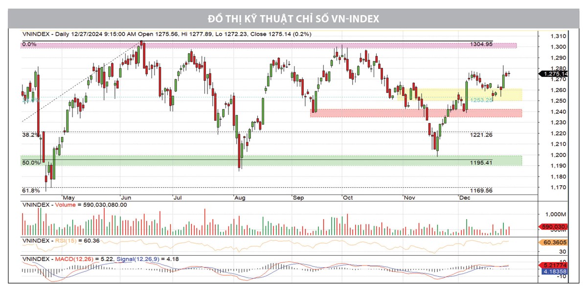 VN-Index đã hoàn thành tuần giao dịch cuối cùng của năm 2024 với khá nhiều tín hiệu tích cực. Với tuần tăng điểm này, tín hiệu suy yếu trong 2 tuần trước đã được cân bằng ngay tại vùng hỗ trợ quan trọng tại 1.250 - 1260 điểm; đồng thời, tạo nền tảng tốt cho những kỳ vọng hướng tới vùng 1.300 điểm trong thời gian tới.