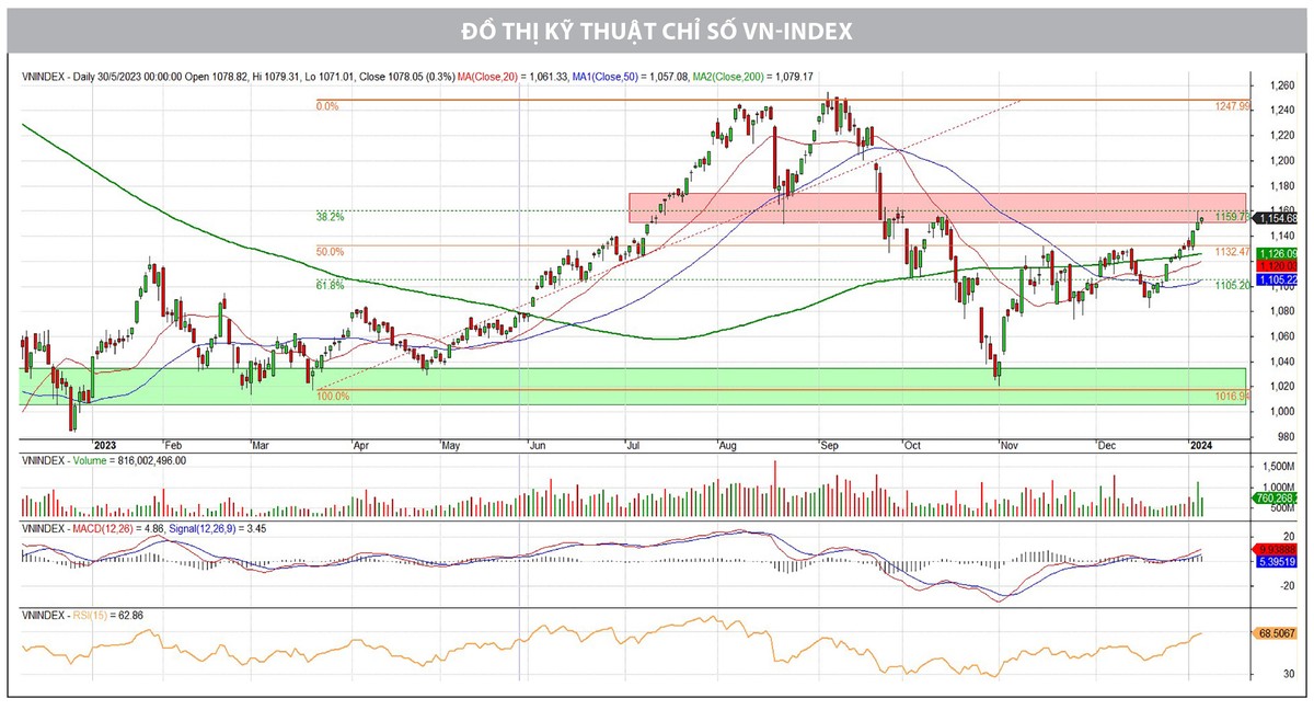 Chỉ số VN-Index bắt đầu năm 2024 với 4 phiên tăng điểm liên tiếp, bứt phá ra khỏi vùng giá hẹp 1.080 - 1.130 điểm đã tích lũy suốt 2 tháng cuối năm 2023, đánh dấu sự chuyển biến lớn về xu thế vận động của thị trường. Trên khung đồ thị tuần, nến tăng đầu tiên của năm 2024 cũng đem lại nhiều tín hiệu khả quan, hình thành là một xu hướng tăng ngắn hạn.