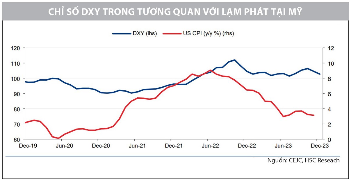 Ở một góc nhìn rộng hơn, chỉ số Dollar Index (DXY) thể hiện xu hướng giảm rõ rệt trong tương quan với lạm phát của Mỹ. Với kỳ vọng lạm phát tại Mỹ sẽ giảm nhanh hơn dự kiến, DXY sẽ có thể giảm xuống dưới mốc 100 trong năm nay. Khi điều này xảy ra, một giai đoạn “tiền rẻ” và ổn định sẽ là tiền đề cho thị trường chứng khoán tăng điểm, nhất là đối với chứng khoán các nước đang phát triển, áp lực mất giá và chênh lệch lãi suất (swap rate) với USD sẽ giảm.