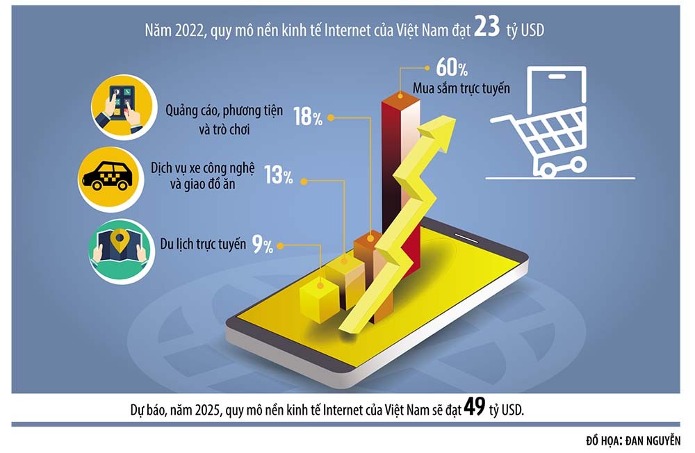 Nếu như năm 2015, nền kinh tế Internet của Việt Nam chỉ đạt quy mô 3 tỷ USD, thì đến năm 2022 đã lên tới 23 tỷ USD và dự báo năm 2025 sẽ đạt 49 tỷ USD.