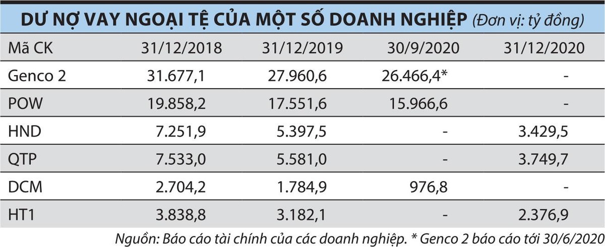 Nhóm có dư nợ vay ngoại tệ chủ yếu là các doanh nghiệp sản xuất với nhu cầu vốn lớn khi xây dựng nhà máy, thường sử dụng nợ vay trong giai đoạn xây dựng và trả nợ dần khi nhà máy hoạt động ổn định. Trên sàn chứng khoán, các doanh nghiệp này là PVPower (POW), Genco 2, Nhiệt điện Hải Phòng (HND), Nhiệt điện Quảng Ninh (QTP), Đạm Cà Mau (DCM), Xi măng Hà Tiên 1 (HT1)…