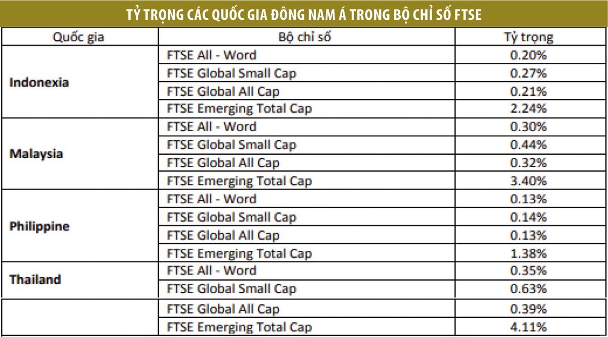 Bên cạnh Việt Nam, các nước cùng khu vực như Thái Lan, Malaysia, Indonesia và Phillipines có tỷ trọng lần lượt là 4,1%; 3,4%; 2,2% và 1,4%. Theo tính toán, nếu Việt Nam vào danh mục với tỷ trọng bình quân 1% thì các quỹ ETF sẽ phân bổ lại tỷ trọng mua vào ở thị trường Việt Nam khoảng 1,6 tỷ USD.