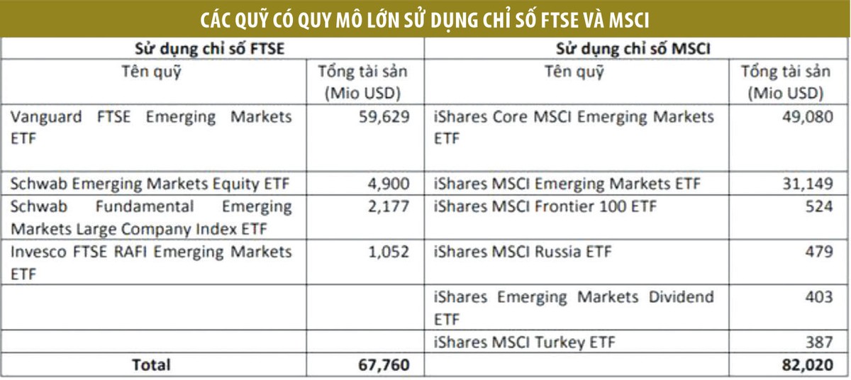 Tính riêng 4 quỹ lớn nhất đầu tư theo chỉ số FTSE khu vực thị trường mới nổi với tổng giá trị tài sản 67,76 tỷ USD gồm Vanguard FTSE Emerging Markets ETF (59,6 tỷ USD), Schwab Emerging Markets Equity ETF (4,9 tỷ USD), Schwab Fundamental Emerging Markets Large Company Index ETF (2,2 tỷ USD) và Invesco FTSE RAFI Emerging Markets ETF (1,1 tỷ USD), mức phân bổ cho thị trường Việt Nam ước đạt khoảng 677 triệu USD.