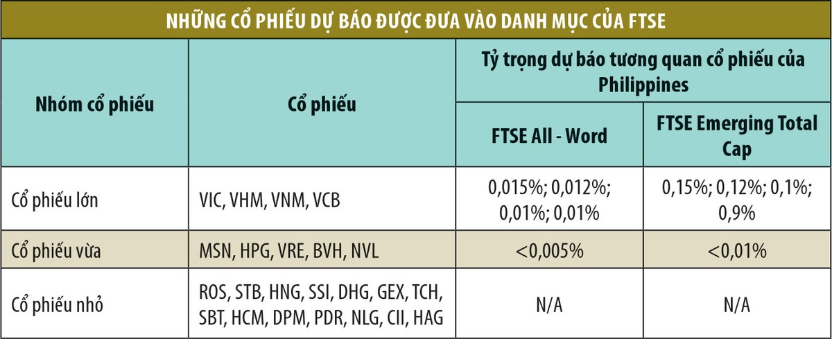 Căn cứ vào những tiêu chí lựa chọn cổ phiếu sau khi quốc gia được nâng hạng như tỷ lệ tối thiểu có quyền biểu quyết, tỷ lệ cổ phiếu tự do chuyển nhượng, tỷ lệ giới hạn đầu tư nước ngoài, thanh khoản và vốn hóa đã áp dụng với Ả Rập Xê-út ở kỳ nâng hạng tháng 9/2018, khả năng sẽ có 24 cổ phiếu Việt Nam được đưa vào danh mục của FTSE (xem bảng).