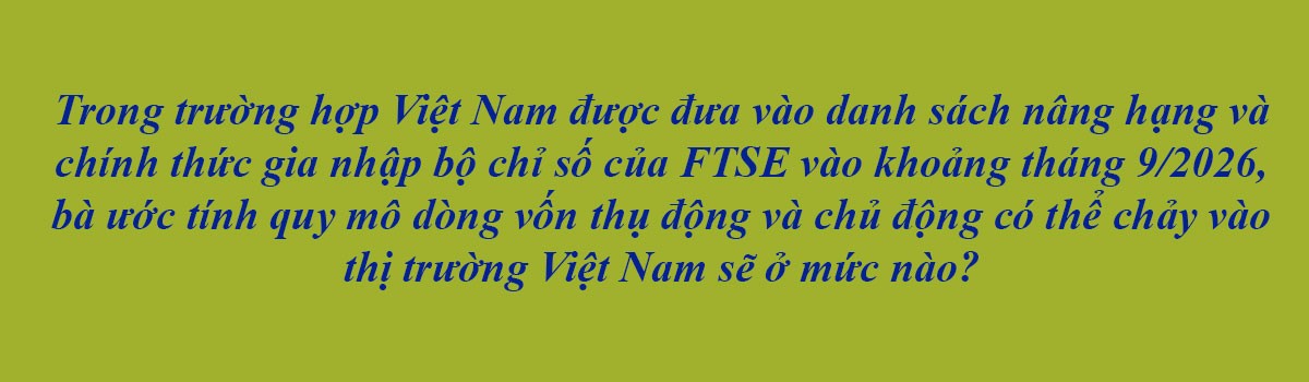 Về quy mô, ước tính tổng dòng vốn liên quan đến câu chuyện nâng hạng có thể đạt khoảng 1,5 - 1,8 tỷ USD đối với dòng vốn thụ động - chủ yếu là các quy tắc theo chỉ số FTSE Emerging và FTSE Emerging All Cap. Các quỹ thụ động thường chỉ giải ngân mạnh sau thời điểm nâng hạng chính thức.