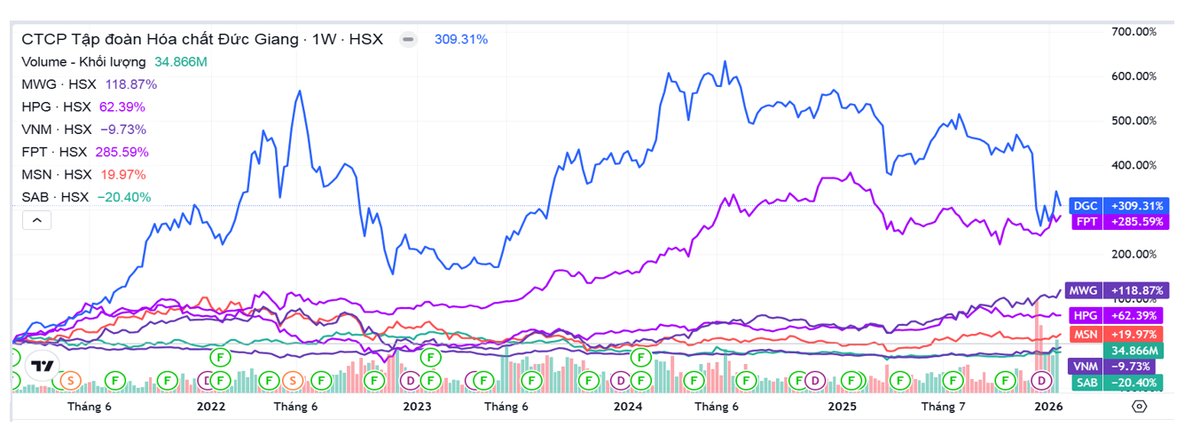 Mặc dù vừa giảm gần 30% trong hơn một tháng, nhưng nếu nhìn trên đồ thị 5 năm, DGC vẫn là một trong những cổ phiếu có mức tăng giá cao nhất trong nhóm VN30, vượt xa nhiều tên tuổi lớn như FPT, HPG, MWG hay MSN.