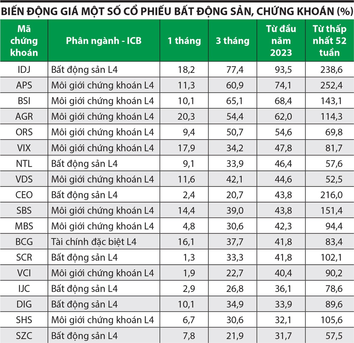 Cụ thể hơn, không khó để kể tên các nhóm ngành tăng mạnh từ đầu năm 2023, hay gần hơn là trong một tháng trở lại đây. Nổi bật là nhóm bất động sản, sau cú rơi cuối năm ngoái thì gần đây, nhóm này thu hút dòng tiền, với những động thái hỗ trợ thị trường bất động sản cũng như trái phiếu doanh nghiệp. Một nhóm khác được nhà đầu tư cá nhân giao dịch tích cực là chứng khoán. Ngoài ra, có thể kể đến các cổ phiếu ngành dược, y tế, nhựa, nông nghiệp, xây dựng, sản xuất và phân phối điện…