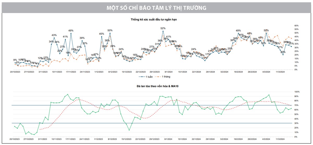 Các chỉ báo tâm lý thị trường cho thấy sự do dự nhất định của dòng tiền khi xác suất đầu tư ngắn hạn giảm sút, đồng thời đà lan tỏa đang trong quá trình kiểm tra lại đường MA10. Dù vậy, các chỉ báo cũng cho thấy chưa có dấu hiệu bán tháo hay hoảng loạn trong tâm lý thị trường nên sóng tăng ngắn hạn được duy trì.