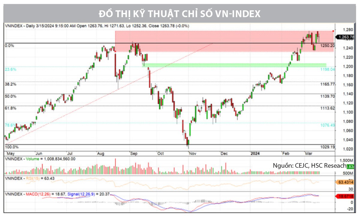 Dưới góc nhìn kỹ thuật, diễn biến rung lắc trong 2 phiên giao dịch cuối tuần qua xuất hiện khi VN-Index nhanh chóng quay trở về vùng đỉnh ngắn hạn cũ, nhưng chưa gây ra bất kỳ sự thay đổi nào về mặt xu hướng trong ngắn hạn của chỉ số chung. Với chặn trên vẫn tại đỉnh ngắn hạn cũ là 1.280 điểm thì vận động của VN-Index đang từng bước củng cố nền giá gần nhất tại 1.235 điểm, nhờ nỗ lực hồi phục trong phiên 13/3. Với khoảng biên độ rộng 40 điểm, đây là vùng dao động đủ lớn để chỉ số có thời gian củng cố và tích lũy ở vùng giá mới, đồng thời hấp thụ những lượng cung tiềm năng tích tụ liên tục trong quãng tăng lớn đến hiện tại.