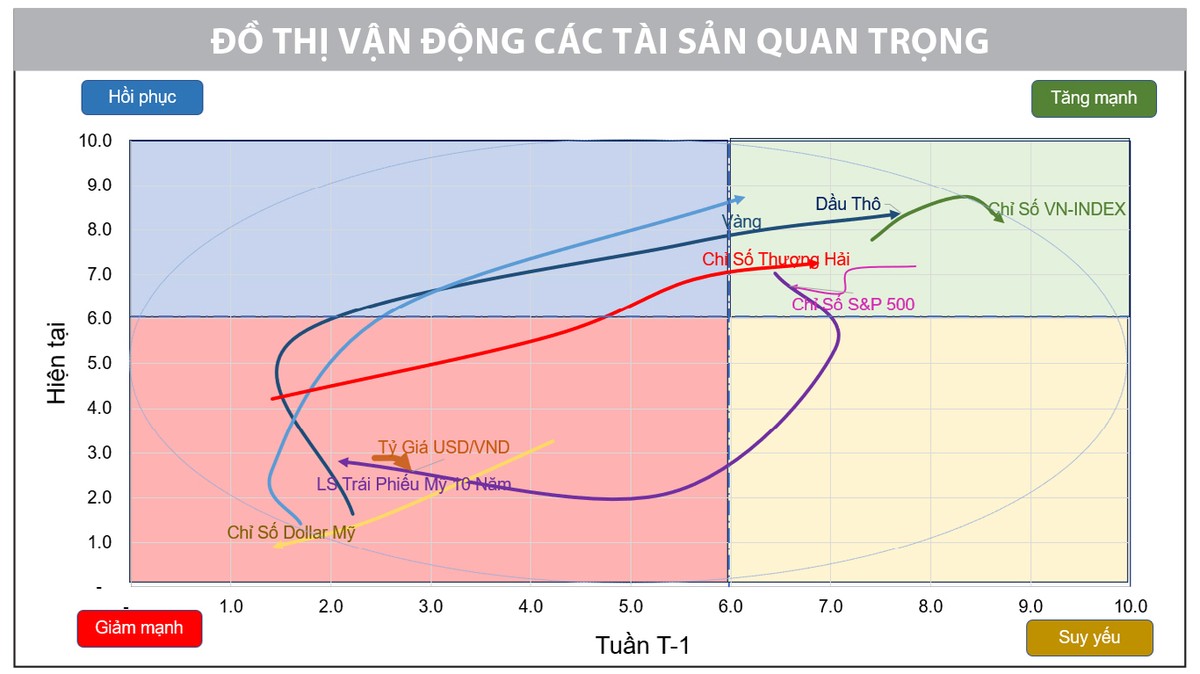 Nhìn trên bảng đồ thị vận động các tài sản, S&P 500 và VN-Index vẫn dao động trong vùng tăng mạnh, cho thấy lòng tin của nhà đầu tư vào thị trường vẫn còn. Tuy nhiên, trạng thái lưỡng lự với diễn biến giằng co quyết liệt đã xuất hiện trong thời gian gần đây, khi không ít nhà đầu tư tiếp tục chốt lời sau giai đoạn tăng trước đó.