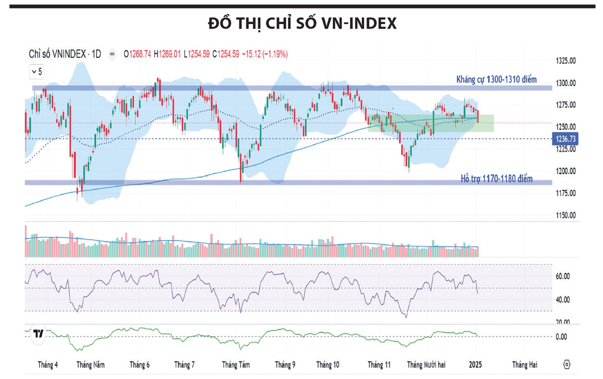 Thị trường chứng khoán tiếp tục điều chỉnh và trầm lắng trong tuần giao thoa giữa năm cũ và năm mới. Chỉ số VN-Index giằng co quanh mốc 1.270 điểm trong hai phiên đầu tuần, cũng là hai phiên cuối cùng của năm 2024. Tuy nhiên, thiếu sự dẫn dắt của các nhóm vốn hóa lớn như ngân hàng, chứng khoán và bất động sản, chỉ số chính tiếp tục điều chỉnh về vùng hỗ trợ thấp hơn, quanh 1.260 điểm trong hai phiên giao dịch cuối tuần.
