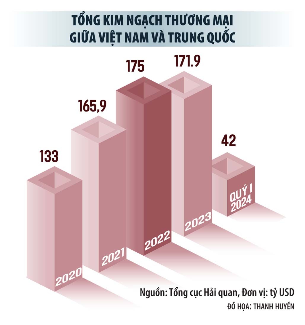 Quý I/2024, thương mại song phương Việt Nam - Trung Quốc tiếp đà tăng tốc, đạt trên 42 tỷ USD. Trong đó, Việt Nam xuất khẩu hàng hóa sang Trung Quốc đạt 12,68 tỷ USD, tăng 5,2%; nhập khẩu từ Trung Quốc 29,4 tỷ USD, tăng 24,4% so với cùng kỳ năm 2023.