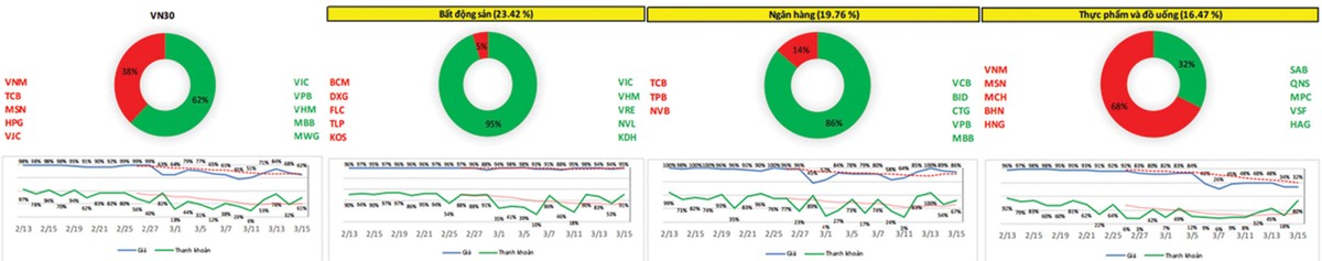 Bất động sản và ngân hàng là 2 nhóm trụ đỡ cho thị trường trong tuần qua, ngoài ra sự đồng thuận diễn ra giữa giá và dòng tiền là trạng thái khá ổn, giá duy trì được đà tăng tốt và có dòng tiền tham gia tương ứng theo đà này. Ở mặt tiêu cực, nhóm thực phẩm và đồ uống (VNM, MSN) đang trở thành gánh nặng cho chỉ số chung, nhưng đâu đó dòng tiền cũng có sự tham gia trở lại ở nhóm này.