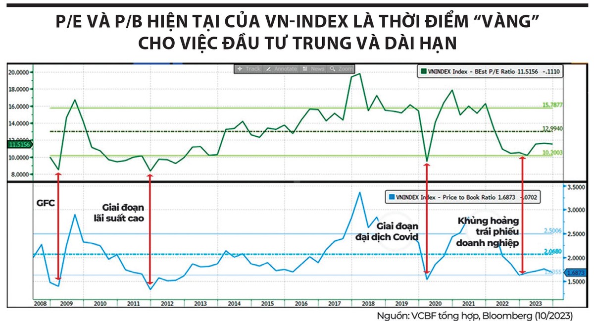 Chuyên gia của VCBF cho biết, ngày 23/10/2023, khi VN-Index ở mức 1.093,53 điểm, cao hơn điểm số hiện nay, thì P/E dự phóng năm 2024 của chỉ số theo số liệu của Bloomberg là 11,5 lần và P/B là 1,7 lần. Những mức định giá thấp như vậy thường chỉ xuất hiện trong những lần xảy ra bất ổn kinh tế lớn như khủng hoảng kinh tế toàn cầu năm 2008, lạm phát cao của Việt Nam năm 2011 - 2012, đại dịch Covid-19 năm 2020, khủng hoảng thị trường trái phiếu doanh nghiệp và thanh khoản quý IV/2022. Diễn biến quá khứ của VN-Index cho thấy, khi P/E và P/B tiếp cận những vùng cận dưới, khả năng thị trường hồi phục sau đó là rất cao.